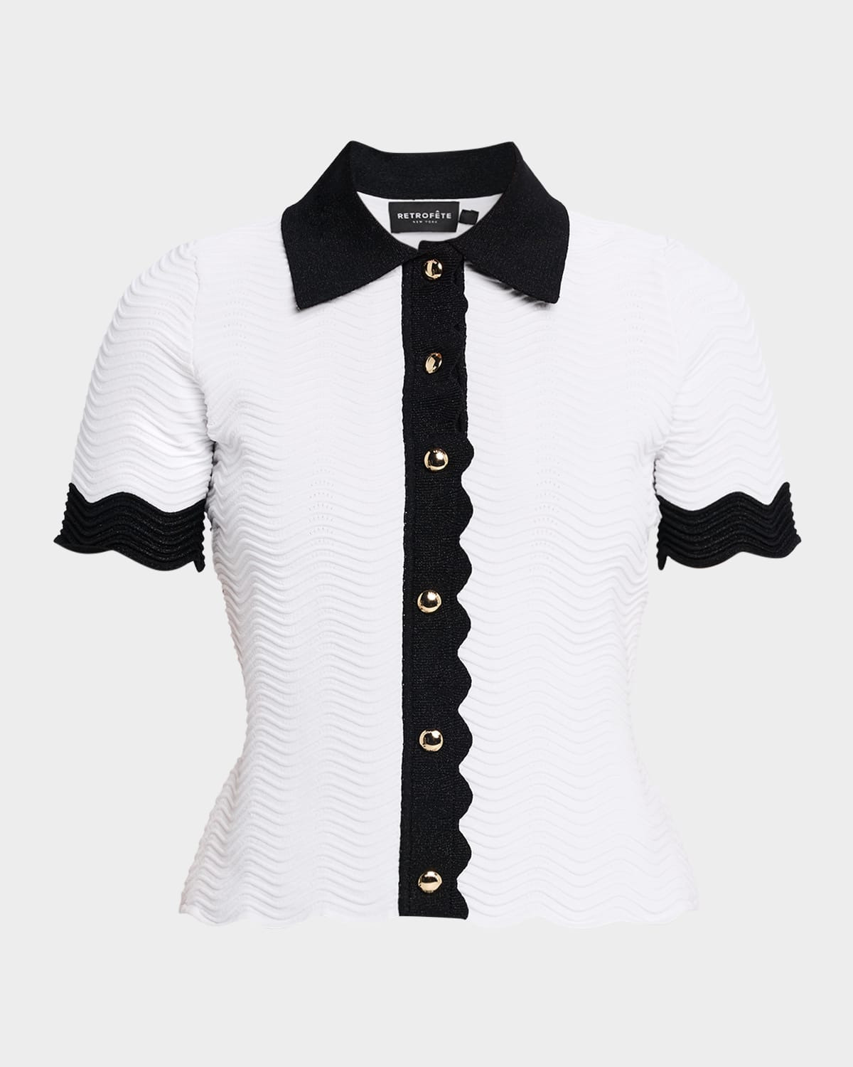 Retrofete "Lyric" wavy knit top finished with contrasting trim Spread collar Short sleeves Fitted Hem sits at the hip Buttonfront Rayon/cellulose acetate/nylon/polyamide/spandex Dry clean Imported