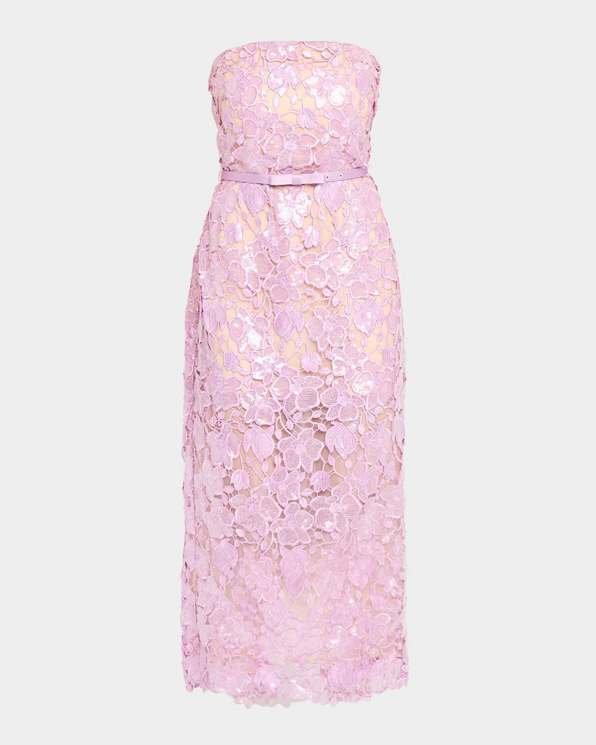 Retrofete "Rowena" sequin-embellished lace overlay midi dress & nbsp; Strapless neckline Sleeveless Bow-embellished belt & nbsp; Sheath silhouette Hem falls below the knee Center back zip & nbsp; Polyester Imported Size Note:Item runs large, consider ordering a size down.