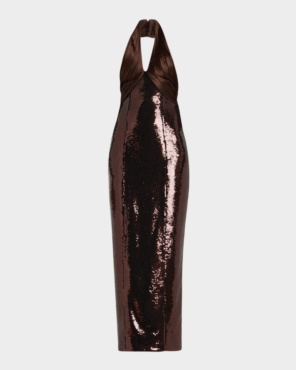 Retrofete "Tamra" sequinembellished dress elevated with a satin halter bodice Plunging neckline Sleeveless Lowcut back Column silhouette Hem falls below the knee Center back zip Acetate/polyester Dry clean Imported