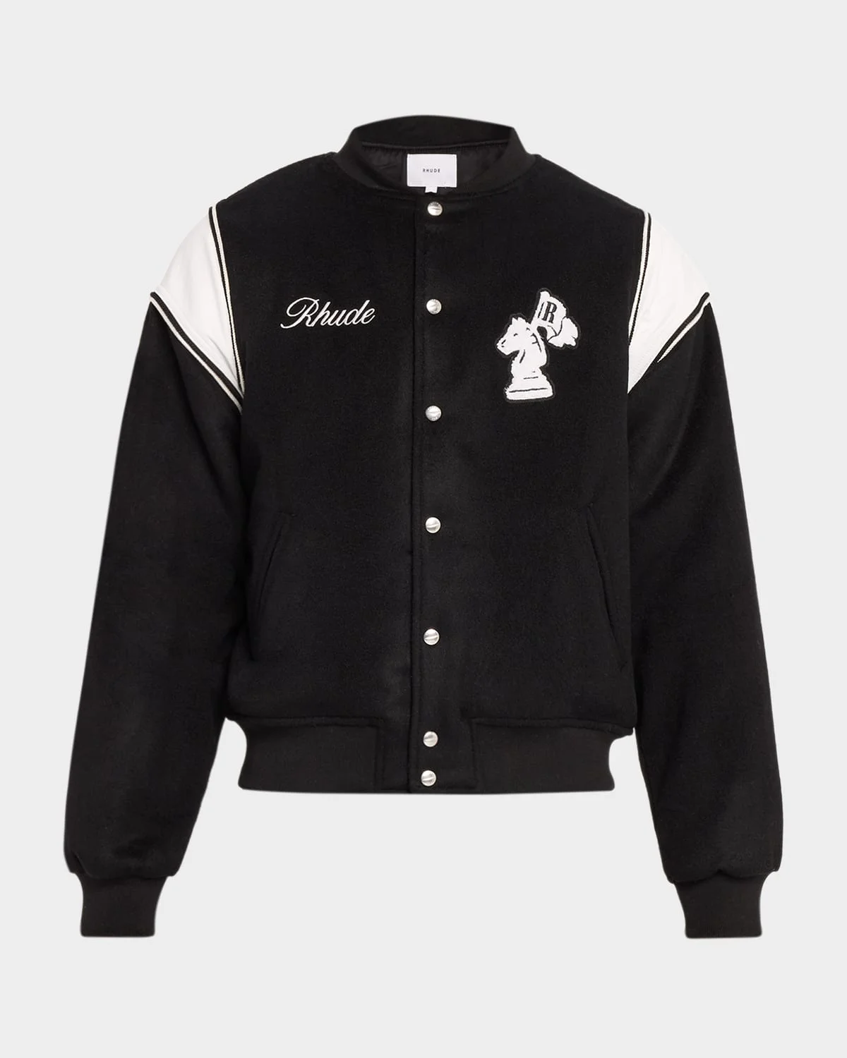 Embroidered with Rhude logo script, the "Regista" bomber is layered with "player" appliques on the front and back for a varsity jacket aesthetic. Baseball collar Long sleeves Snap placket front Side slip pockets Banded cuffs and hem Wool/nylon/polyamide Dry clean Made in USA