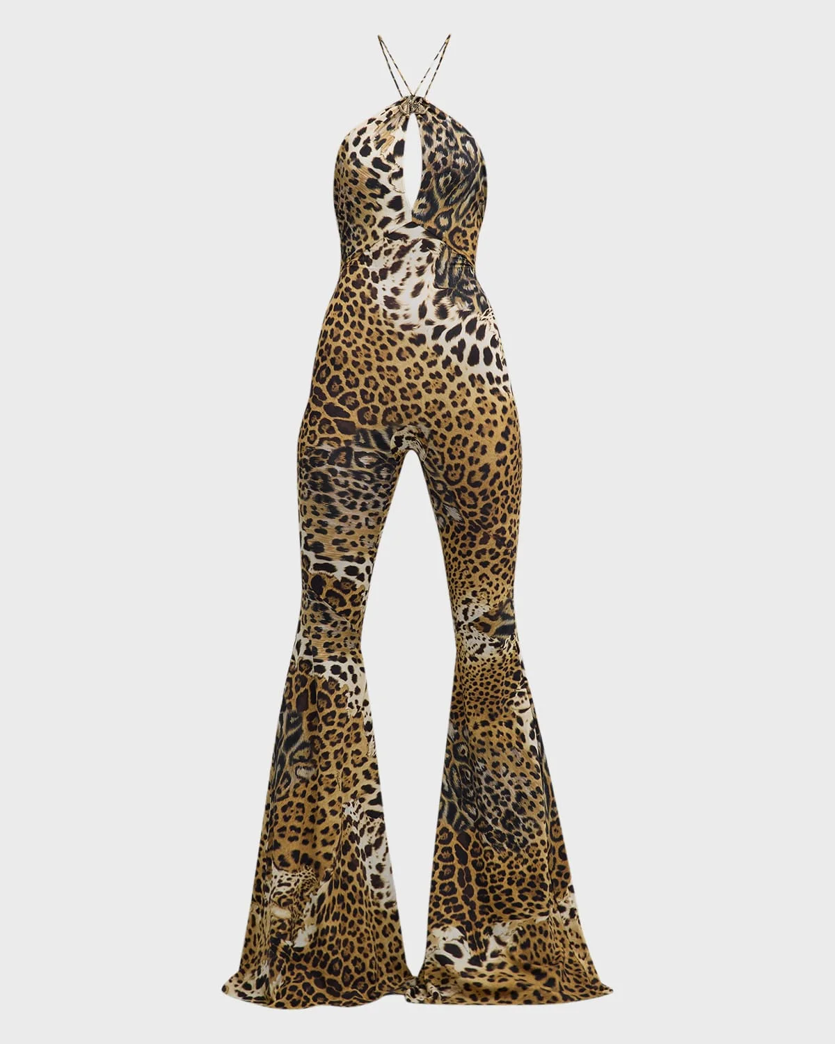 Roberto Cavalli leopardprint jumpsuit featuring crystal logo, keyhole front, and a selftie open back Halter neckline; selftie back Sleeveless Flare legs Full length Pullon style Nylon/polyamide/elastane Made in Italy