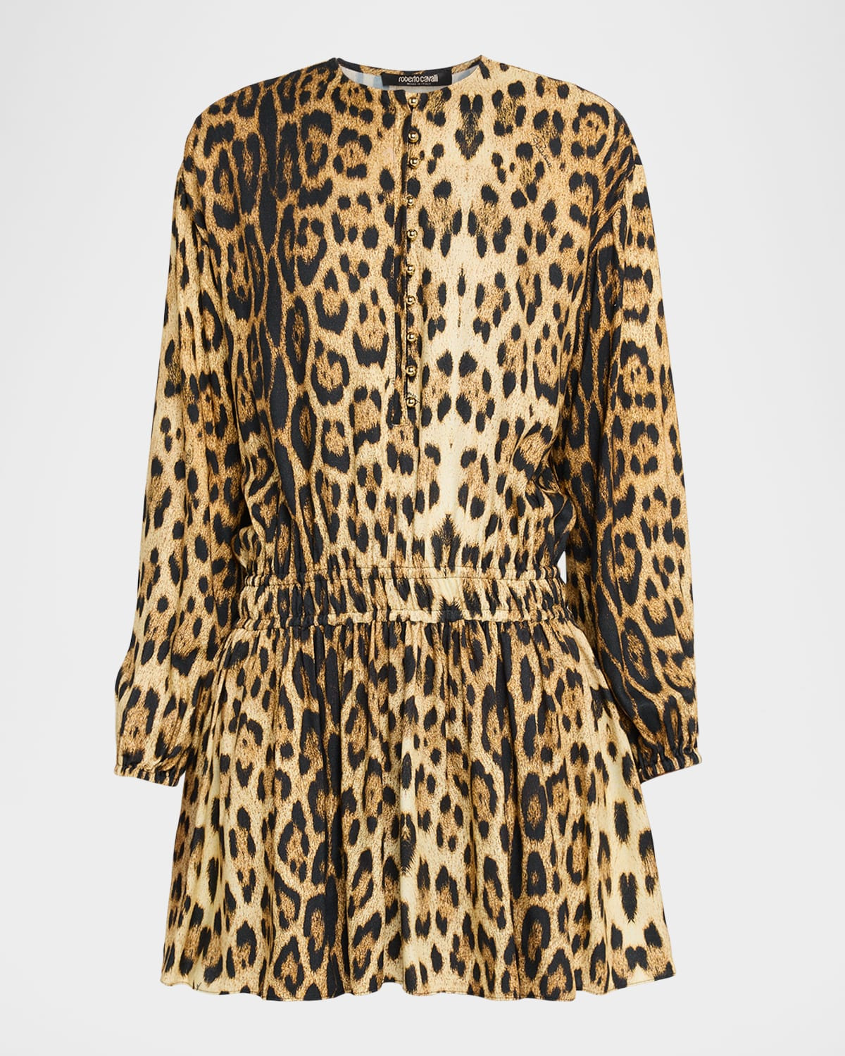 - Roberto Cavalli leopard printed dress featuring an elasticized waistband and a blouson bodice - Round neckline; half button front - Long sleeves; elastic cuffs - Fit-and-flare silhouette - Mini length - Slipover style - Viscose - Made in Italy