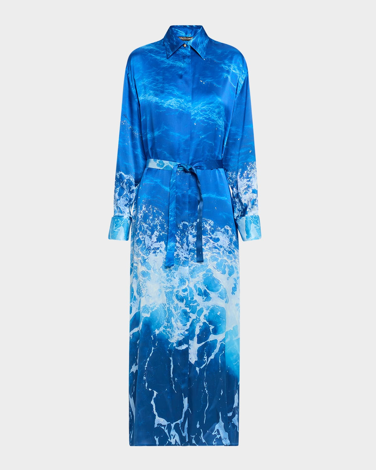 - Roberto Cavalli shirtdress with a Sicily ocean print and a waist sash - Point collar; concealed button front - Long sleeves; button cuffs - Self-tie belted waist - Shift silhouette - Full length - Side slit hem - Silk - Made in Italy