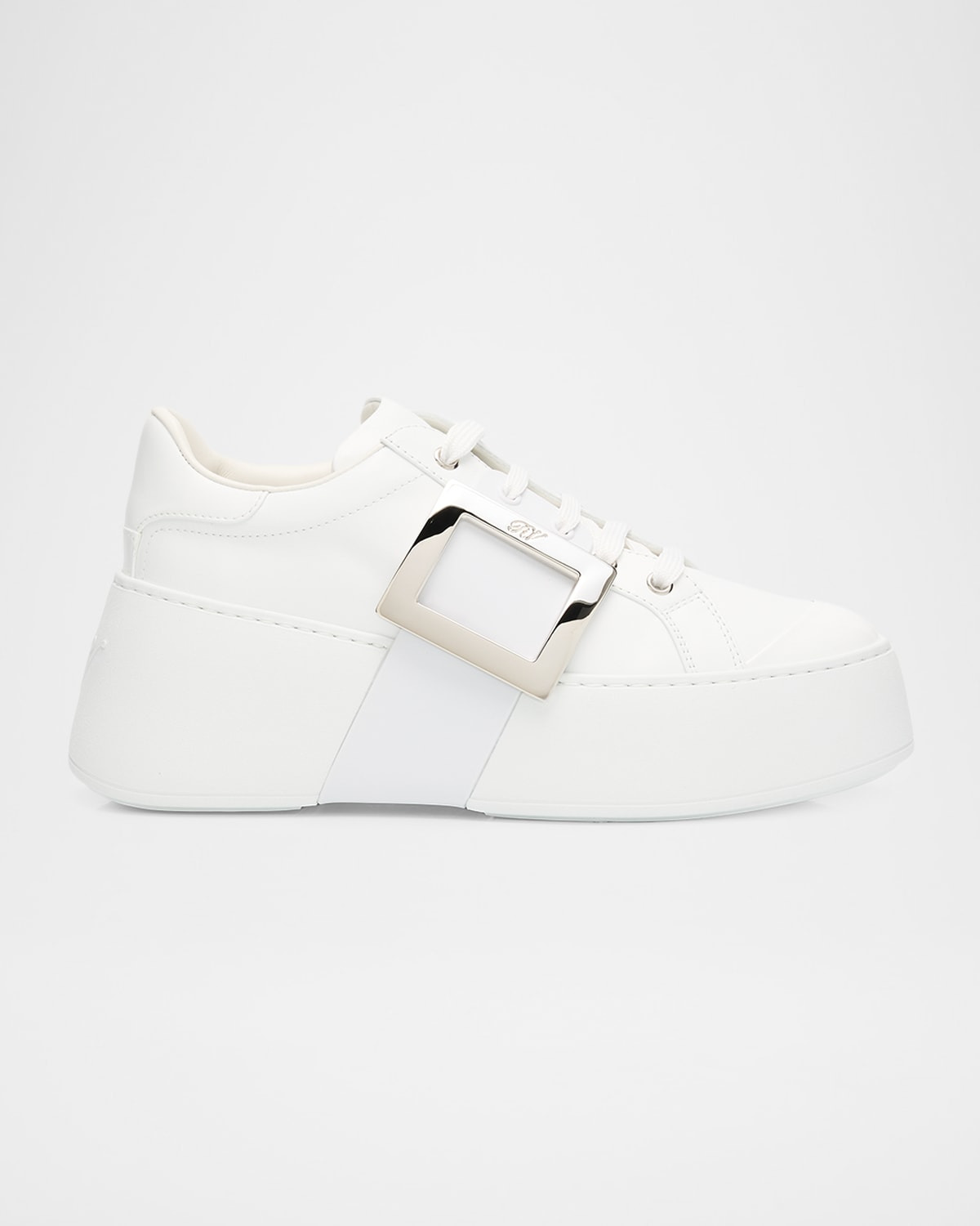- Roger Vivier "Viv' Skate" low-top sneakers in smooth leather. - Signature pilgrim buckle accent. - Flat chunky heel. - Round toe. - Lace-up vamp. - Leather lining. - Rubber sole. - Made in Italy.
