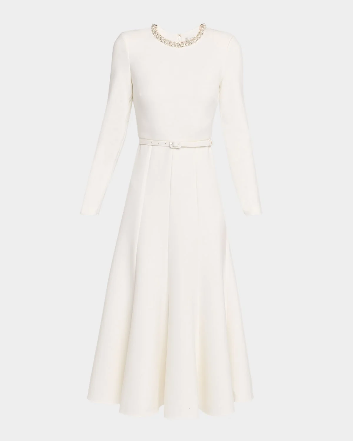 Crystal-Neck Belted Long-Sleeve Midi Dress