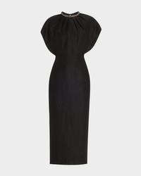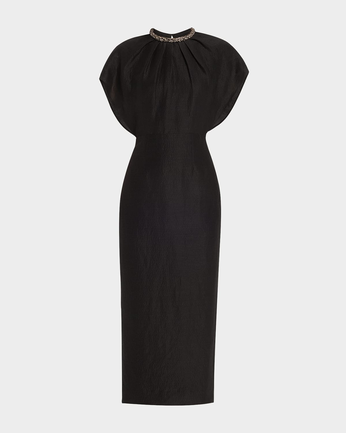 - Roland Mouret dress features diamante embellishment on the gathered neckline - Round neckline - Short puff sleeves - Hem falls below the knee - Sheath silhouette - Back walking slit - Zip closure - Polyester - Dry clean - Trim: Metal, crystal - Imported - Proposition 65 warning for California residents