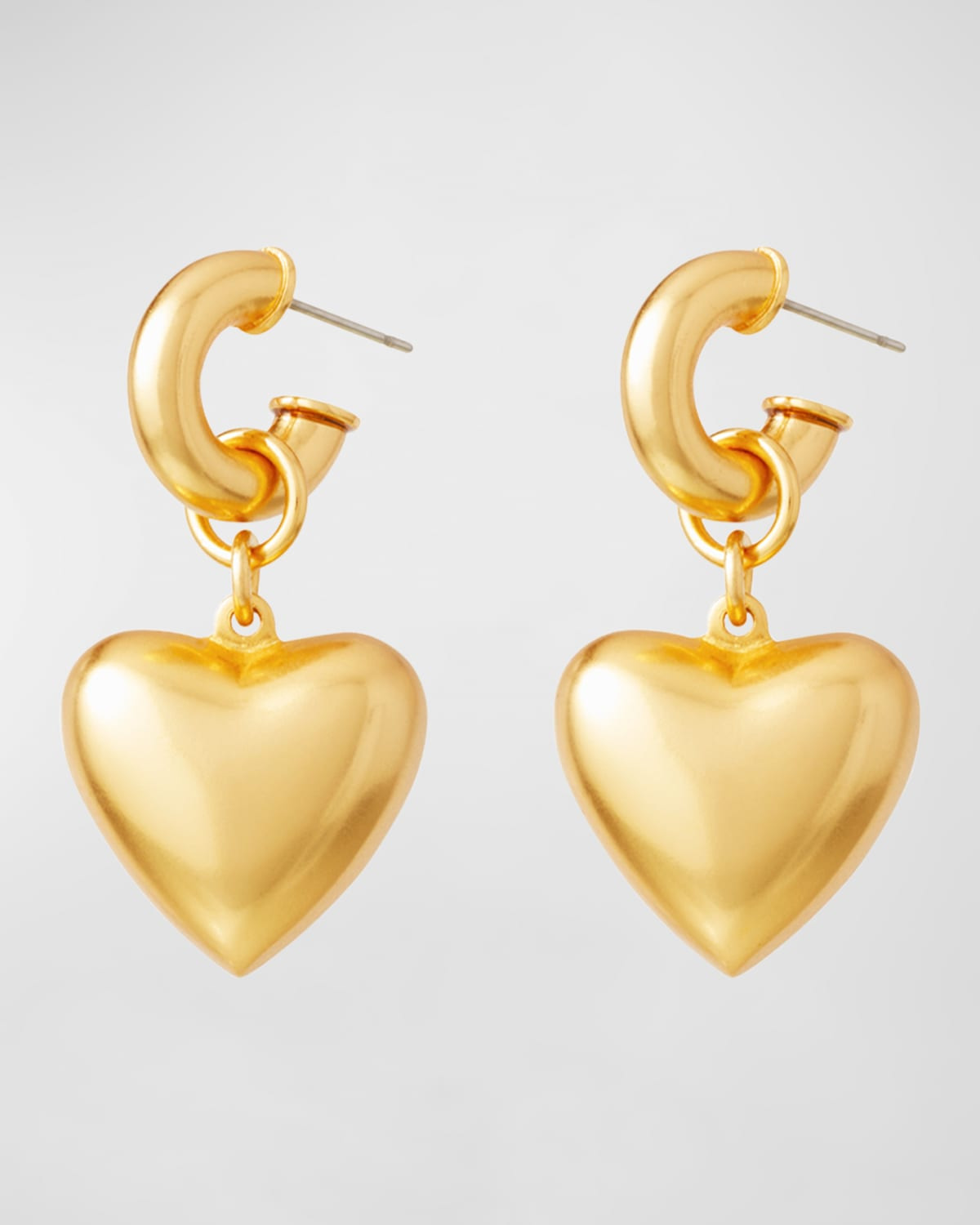 - Roxanne Assoulin puffy earrings - Approx. 1.5"L - Huggie hoops with heart drops - For pierced ears - Brass/titanium - Imported