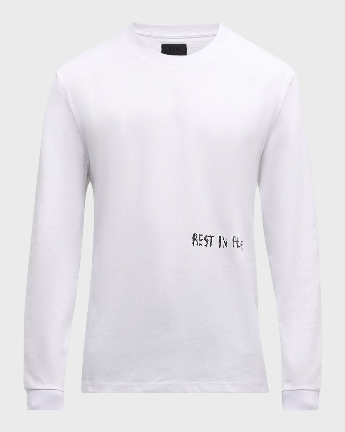 - RTA "Lawrence" T-shirt featuring the signature RTA cross - "Rest in Peace" print on front - Crew neckline - Classic fit - Long sleeves - Banded cuffs - Pullover style - Cotton - Machine wash cold - Imported - Model is 6'1"/185cm.