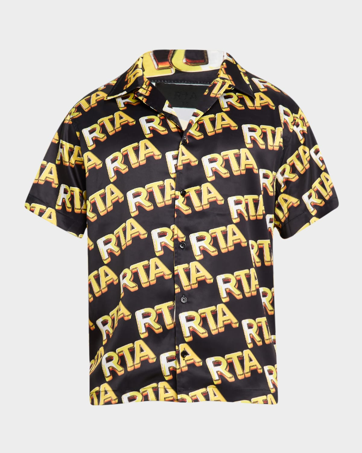 - RTA "Nathan" satin logo-print shirt - Notched collar; button-front - Short sleeves - Classic fit - Polyester - Hand wash - Imported