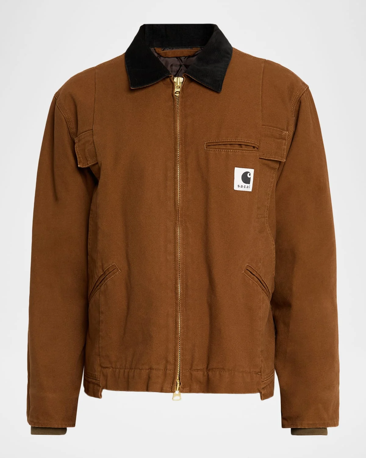 SACAI x CARHARTT WIP jacket crafted from signature triplestitched, durable duck canvas with a waterresistant finish Corduroy spread collar; twoway front zip Long sleeves Logo patch at left chest Front besom pockets Relaxed fit Midlength Cotton/polyester/polyurethane Dry clean Made in Japan