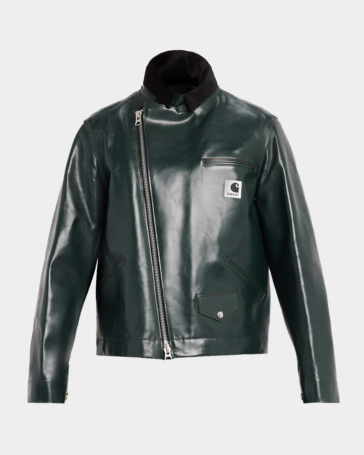 Crafted with a luxurious premium calf leather shell, this SACAI x CARHARTT WIP moto jacket features a cotton corduroy collar and silvertone hardware Spread collar; snap throat latch Long sleeves Chest zipper pocket above a logo patch Slanted side pockets Relaxed fit Midlength Twoway front zipper closure Leather/cotton/polyester Dry clean Made in Japan
