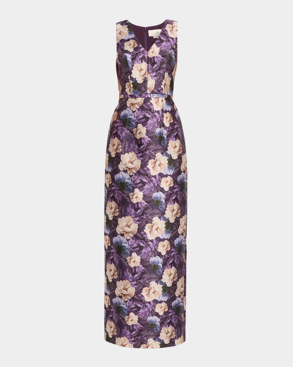 Striking yet polished, the "Adellyn" gown from Sachin amp; Babi is cut from a structured floralprint mikado, designed in a sophisticated column silhouette with a flattering waistband detail Approx. 60.5"L from shoulders to hem V neckline Sleeveless Princess seams Column silhouette Full length Center back slit Invisible back zipper Polyester Dry clean Imported