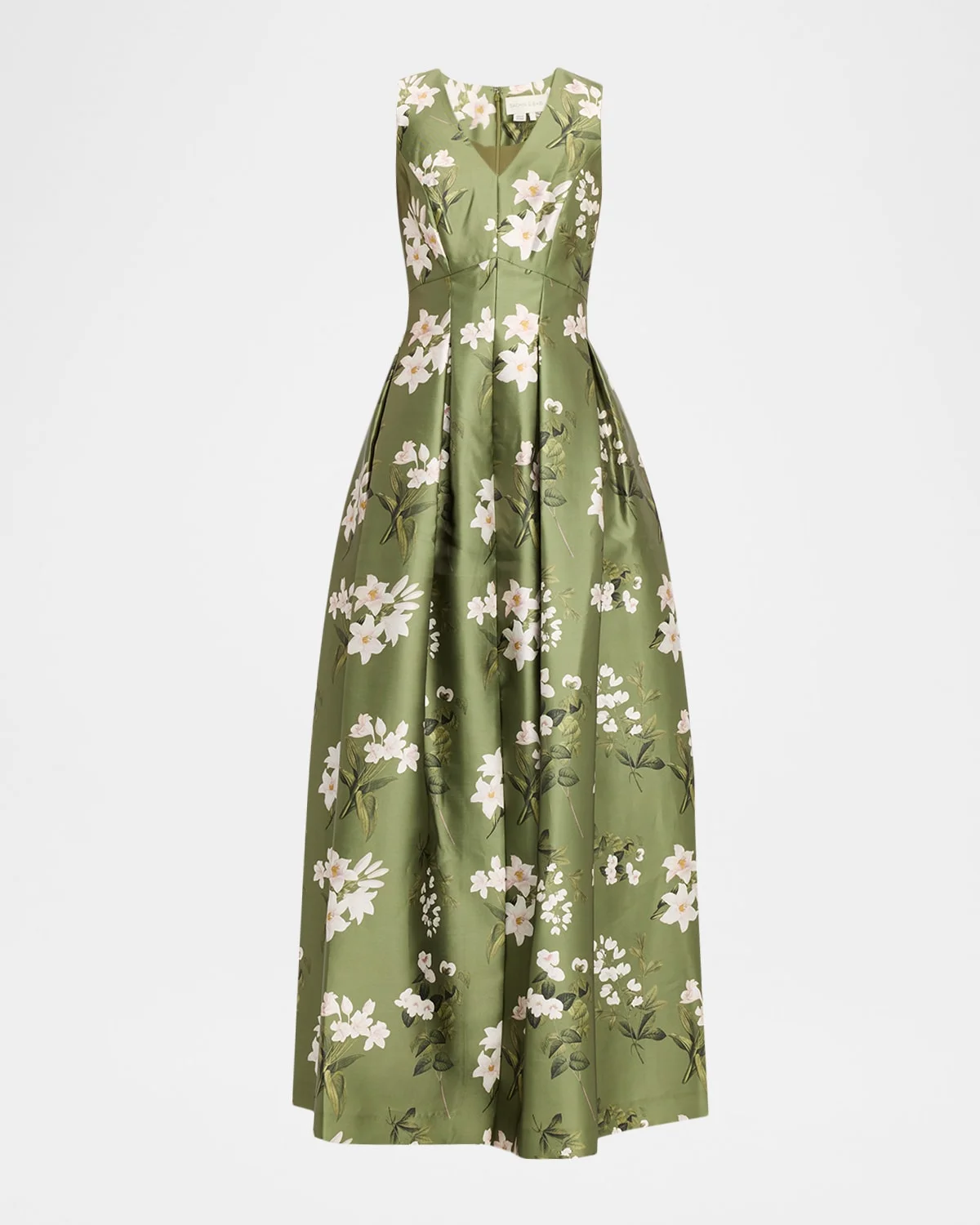 This Sachin amp; Babi "Brooke" gown is cut from floralprint mikado with elegant box pleats to add full volume to the skirt Approx. 60.5"L from shoulders to hem V neckline Sleeveless Princess seams Onseam pockets Center front slit Full length Aline silhouette Invisible back zipper Polyester Lining: Polyester Dry clean Imported