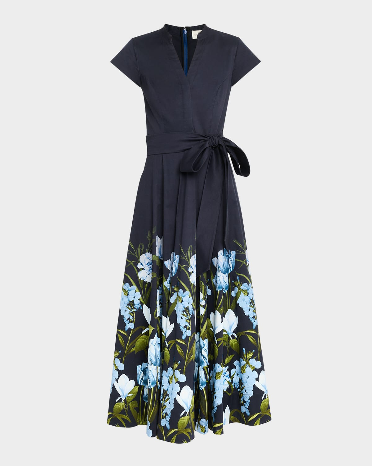 Sachin amp; Babi "Gannika" midi dress features a floral border print Approx. 50"L from shoulders to hem V neckline; concealed button front Cap sleeves Waist selftie Hem falls below the knee Aline silhouette Invisible back zipper Cotton/spandex Imported