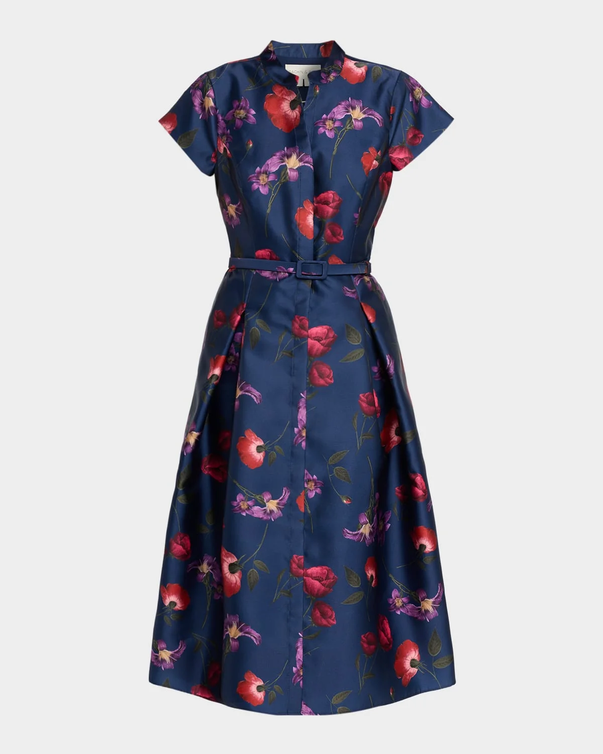 This Sachin amp; Babi "Martine" midi dress is cut from lustrous floralprint mikado, detailed with crisp pleats and a matching belt to cinch the waist Approx. 48"L from shoulders to hem Band collar; concealed button front Short sleeves Princess seams Belted waist Hem falls below the knee Aline silhouette Polyester Lining: Polyester Dry clean Imported