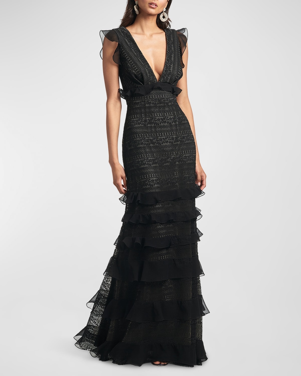 - Sachin & Babi Noir "Serafina" lace gown with ruffle tiers and bust pleats - Approx. 62"L from shoulders to hem - Deep V neckline - Sleeveless - Empire waist - Floor length - Column silhouette - Viscose/nylon/cotton - Dry clean - Imported - Model is 5'10"/177cm.