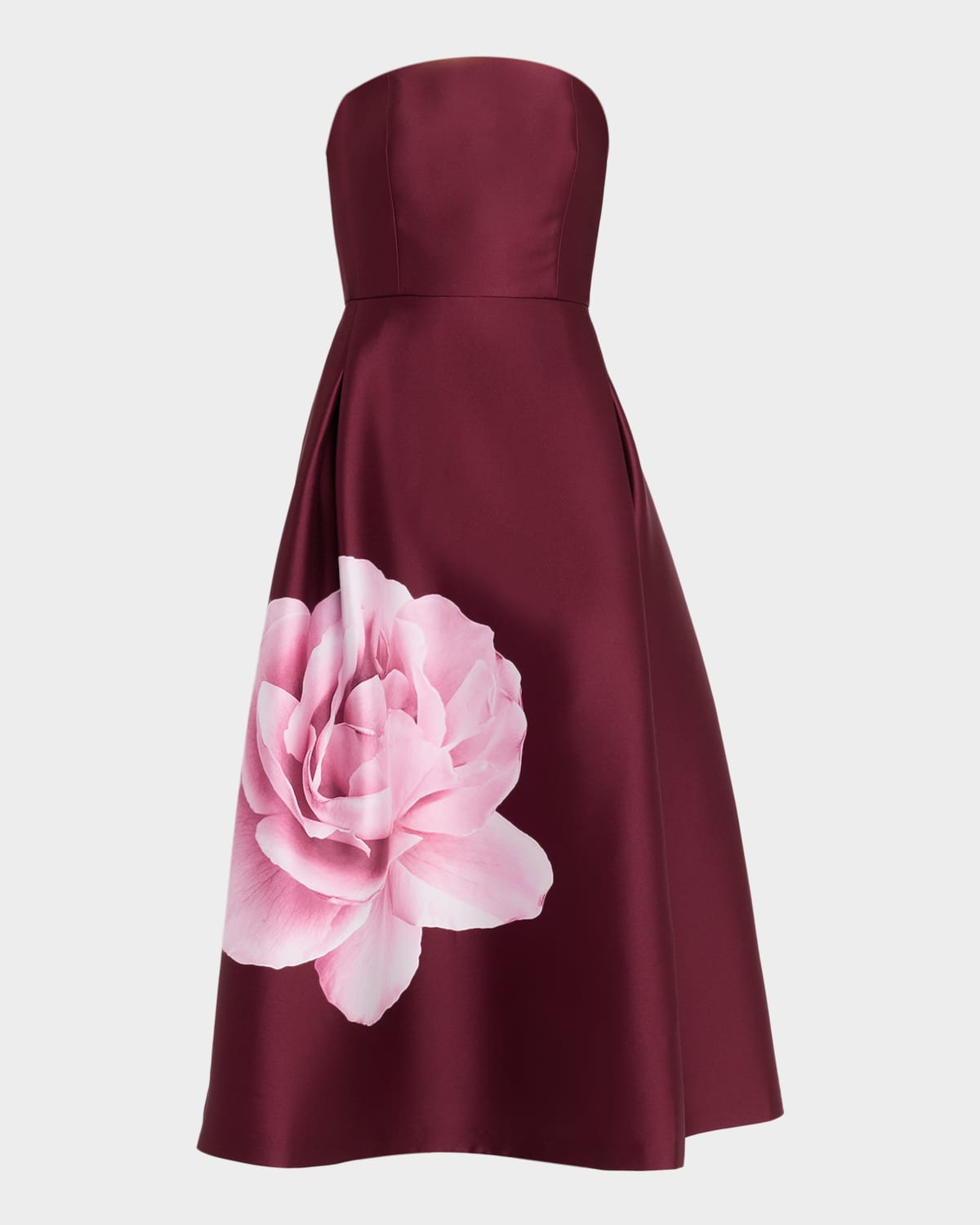 This Sachin amp; Babi "Shay" midi dress is cut from stretch mikado with a delicate rose printed on the skirt. A side pleat adds extra flair to the skirt, and princess seams tailor the bodice for a slimmer fit. Approx. 50"L from shoulders to hem Strapless neckline Sleeveless Princess seams Onseam pockets Hem falls below the knee Aline silhouette Invisible back zipper Polyester/spandex Imported