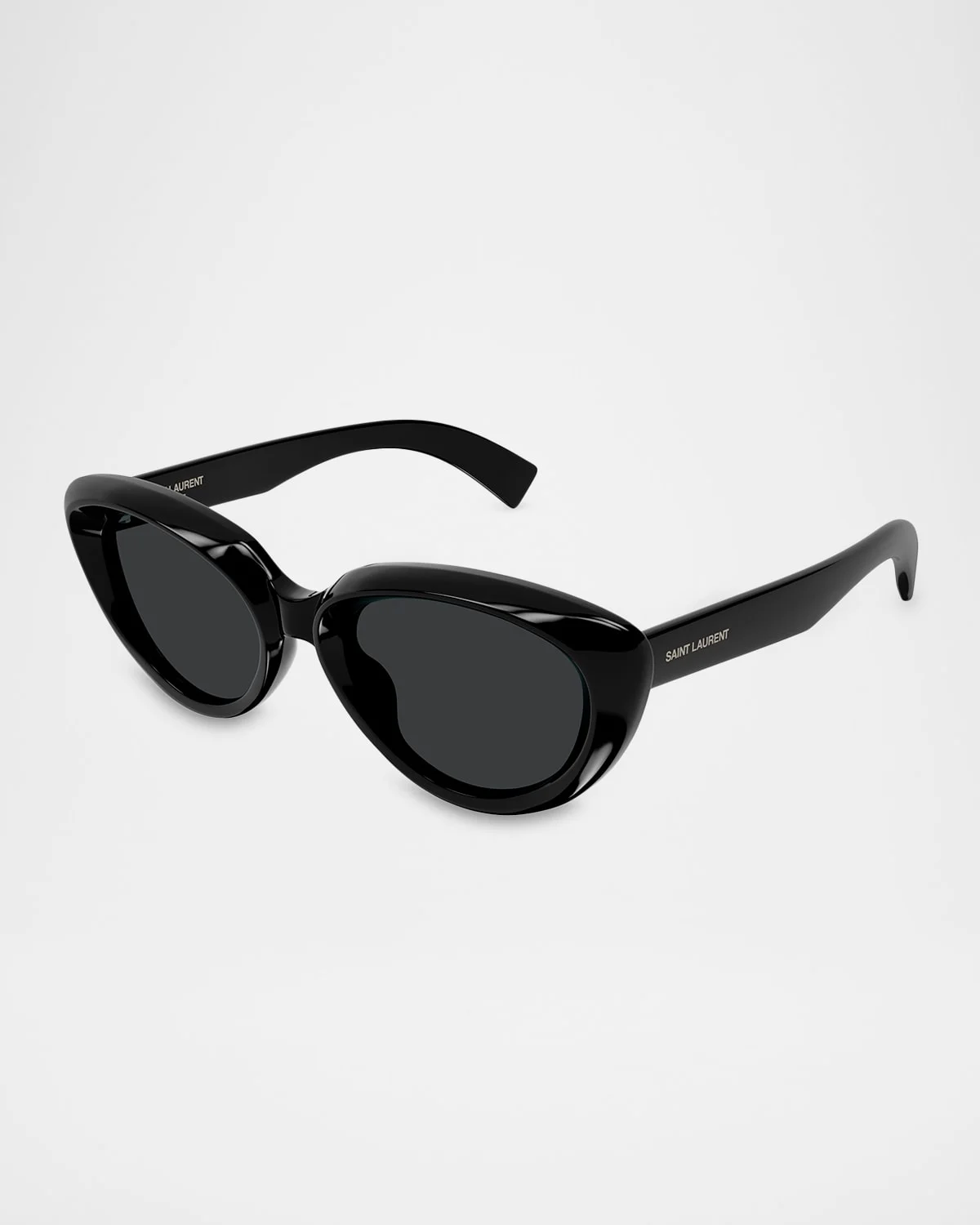 Saint Laurent "SL 859-00" sunglasses feature a soft cat-eye silhouette with bold, rounded edges. Eye/bridge/temple (in mm): 53-20-145 Monochromatic lenses Saddle nose bridge Engraved logo temples Acetate 100% UVA/UVB protection Made in Italy