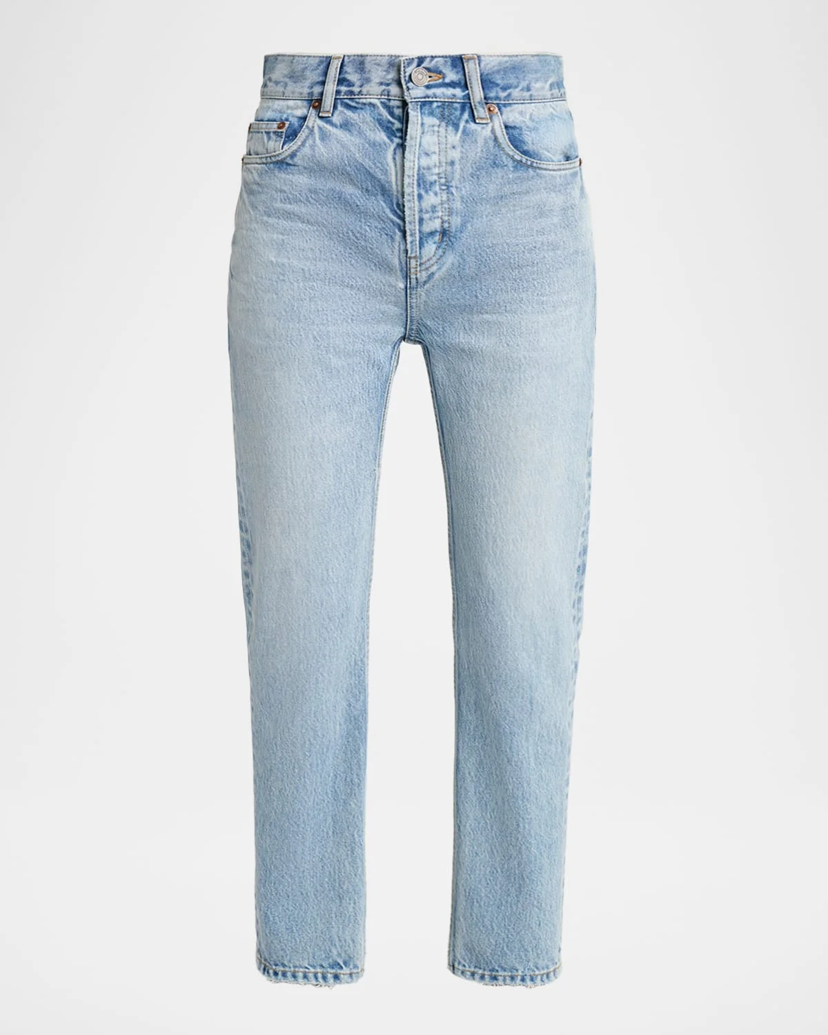 Saint Laurent denim jeans feature & nbsp;a & nbsp;vintage-inspired cut that is slightly slimmer through the leg and cropped at the ankle, providing a lived-in feel through heavy whiskering and fading. High rise Waistband with belt loops Five-pocket style Saint Laurent Paris embossed leather patch Cropped length Straight legs Button fly Cotton/leather Dry clean Made in Japan SIZE & FITModel measurements: 5 & apos;10" tallModel is wearing a US size 4/Small