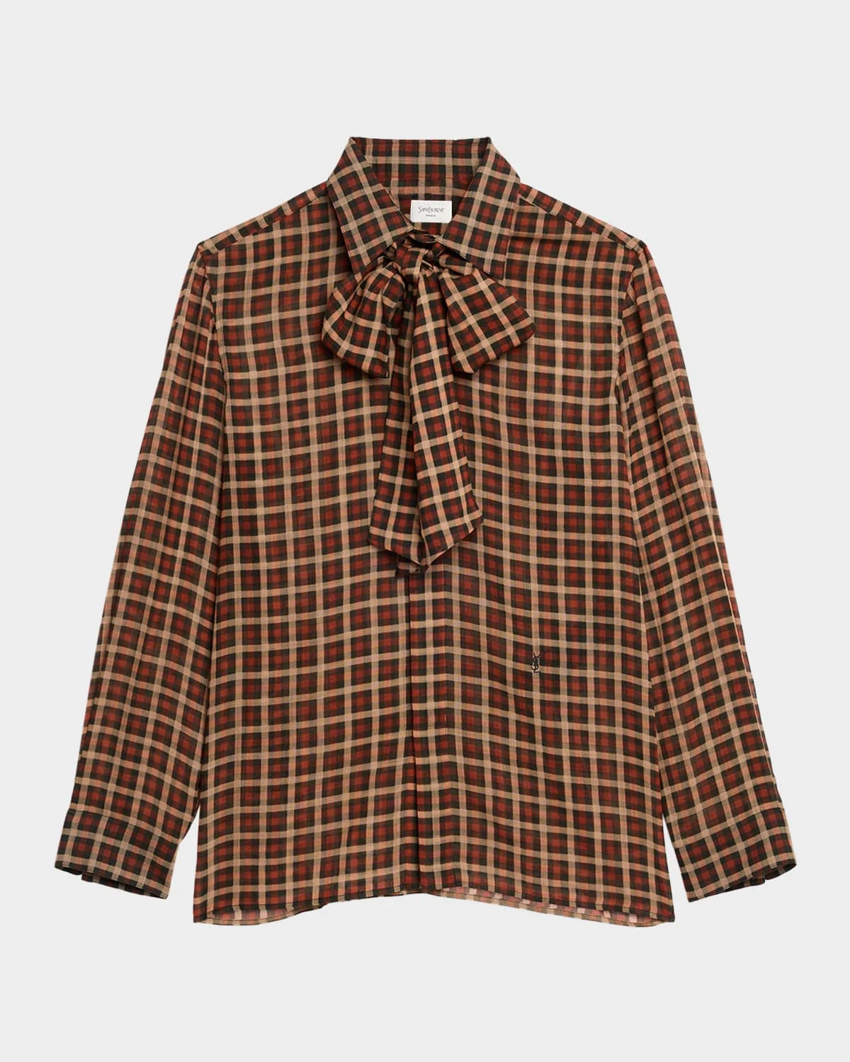 Saint Laurent "Cassandre" shirt is crafted of vicy silk with a plaid print, a selftie bow neck, and signature YSL embroidered hip Band collar; concealed button front Long sleeves; button cuffs Relaxed fit Hip length Concealed button front Silk Made in Italy