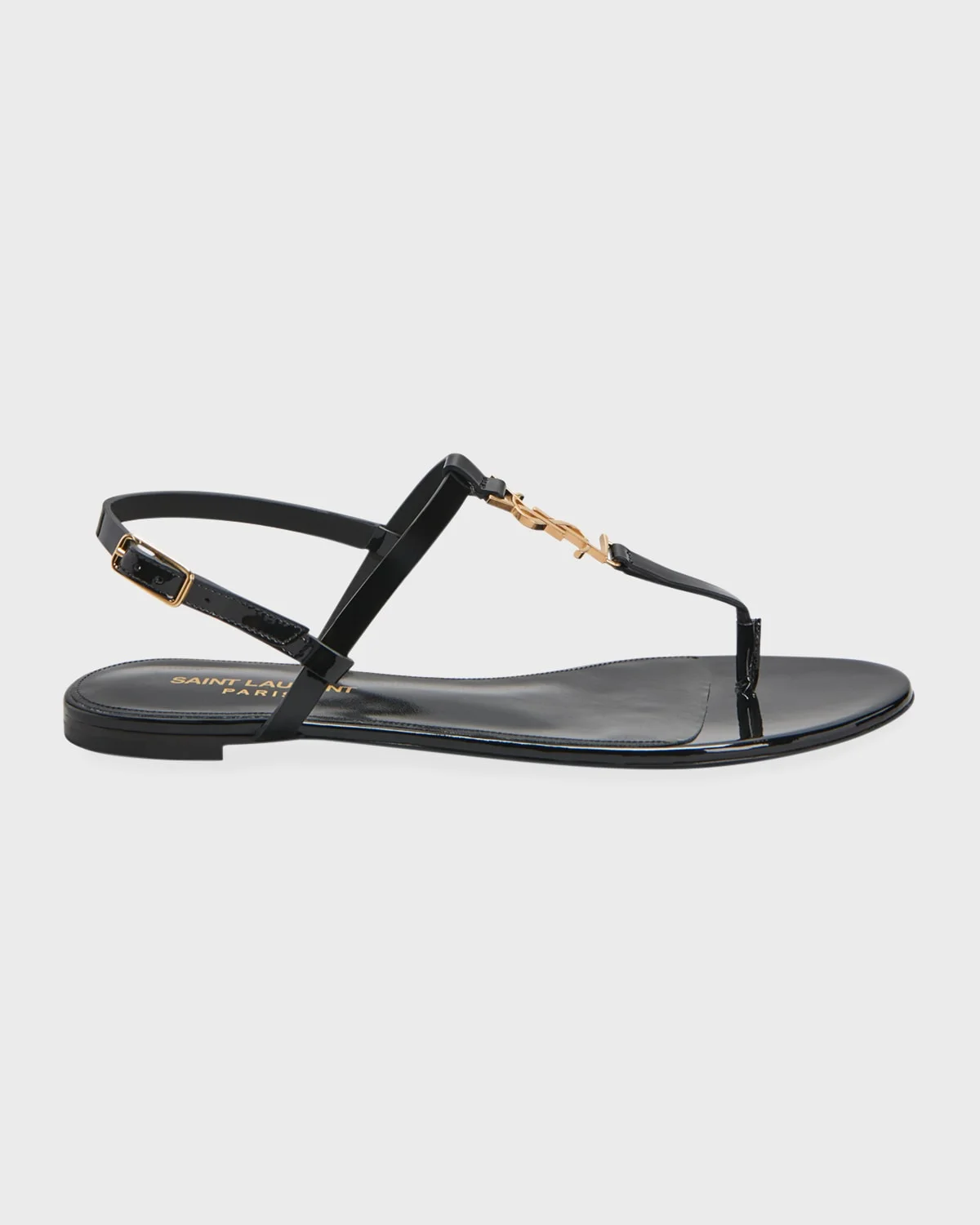 - Saint Laurent "Cassandra" leather sandals. - Flat heel. - Open toe. - Thong strap with YSL medallion. - Adjustable slingback strap. - Made in Italy. Heel height may vary by size.