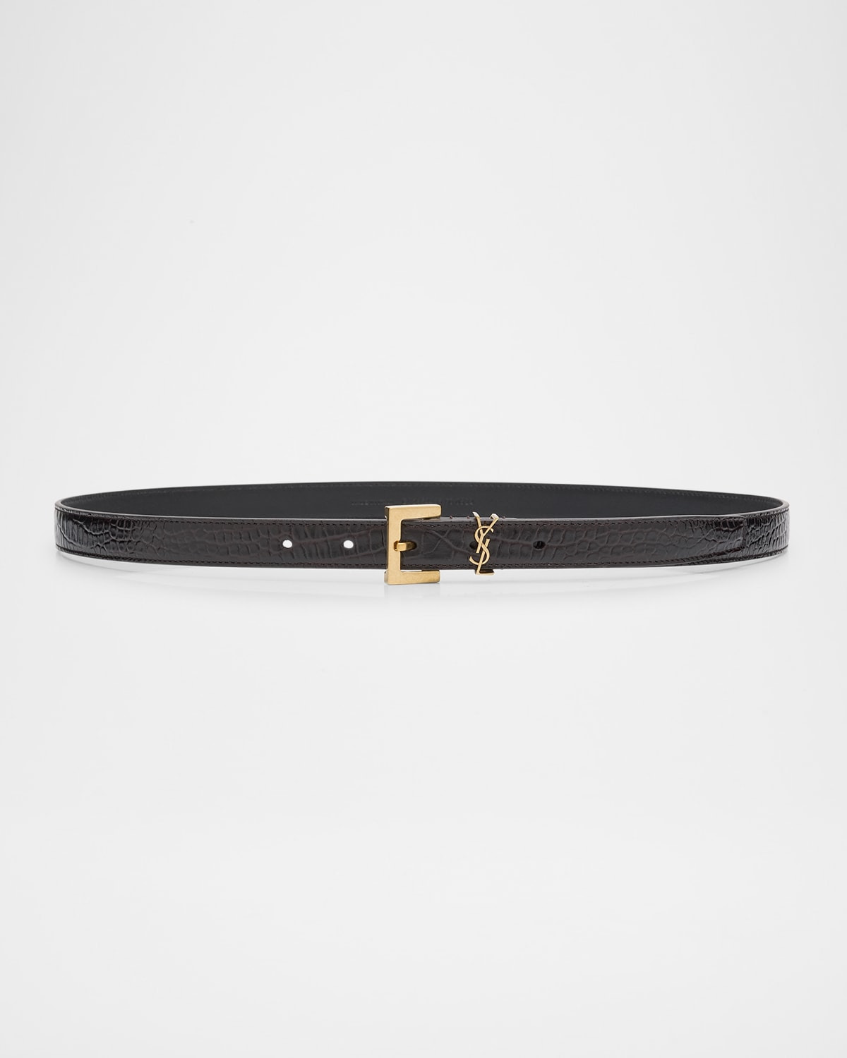 - Saint Laurent "Cassandre" skinny belt in croc-embossed leather - Approx. 0.8"W - Features signature YSL logo accent - Cut to size - Professional cleaning recommended - Made in Italy - Proposition 65 warning for California residents