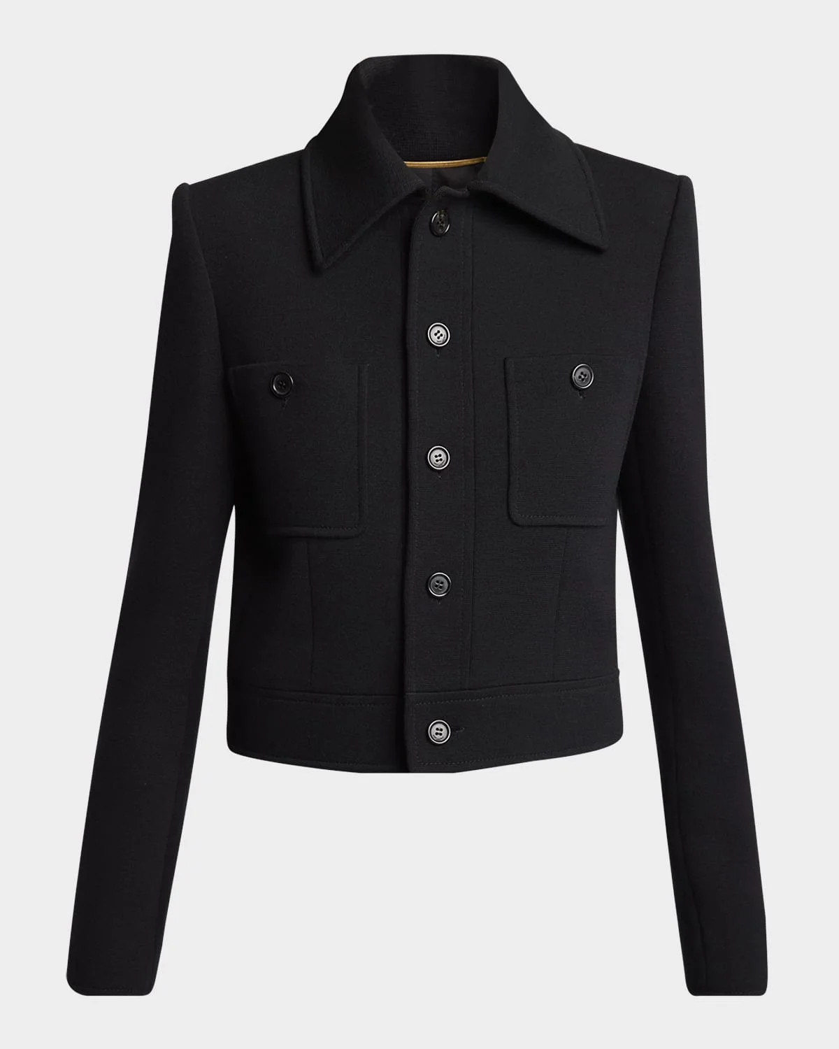 - Saint Laurent solid jacket - Spread collar; button front - Long sleeves; button cuffs - Chest buttoned pockets - Fitted - Wool/nylon/polyamide - Made in Italy - Proposition 65 warning for California residents