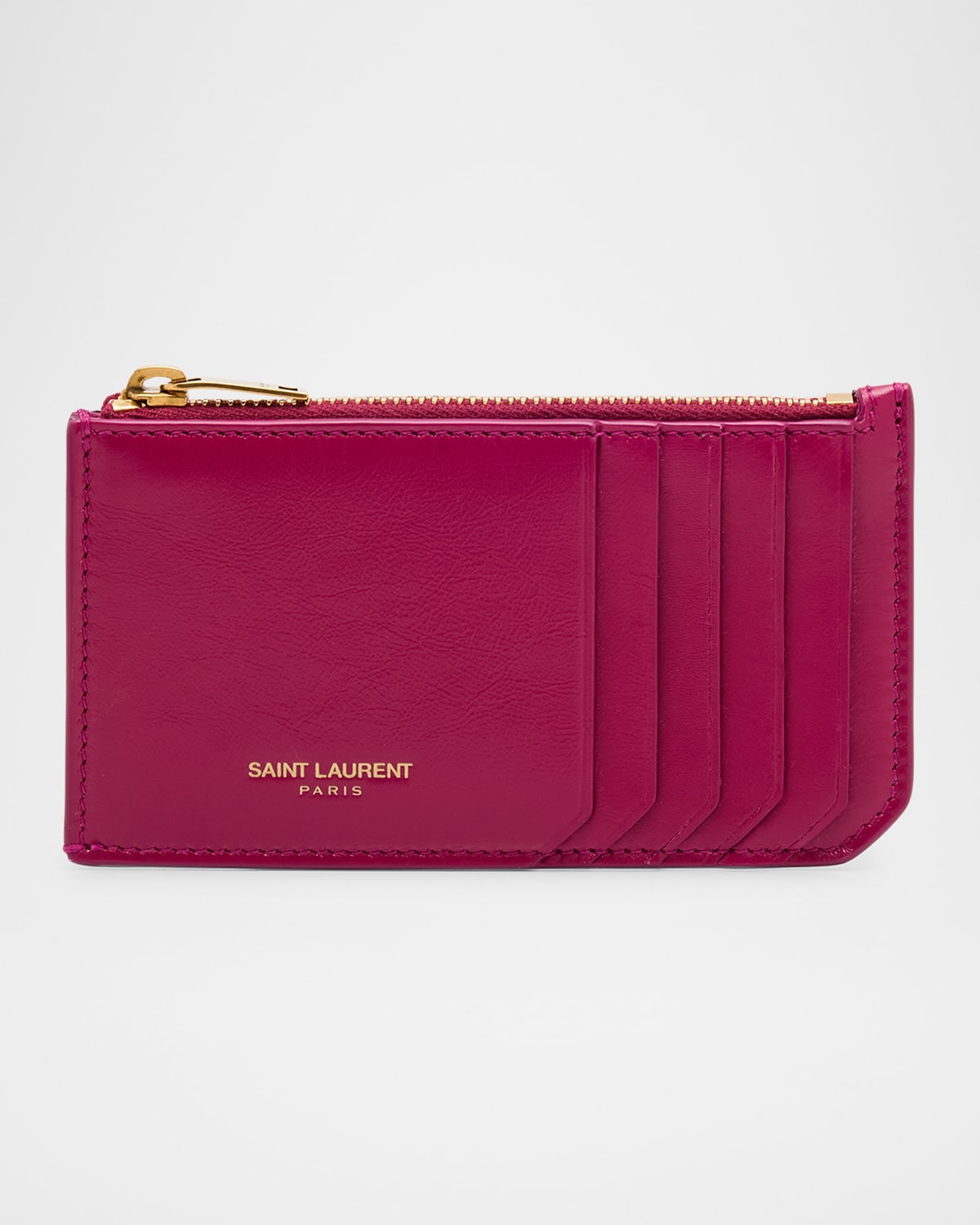- Saint Laurent "Fragments" card case in calfskin leather, detailed with logo lettering - Zip top compartment - Five card slots - Approx. 2.9"H x 5.1"W x 0.3"D - Made in Italy