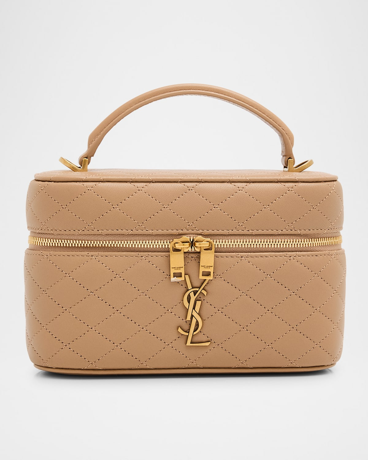 - Saint Laurent "Vanity" top handle bag in quilted leather - Features signature YSL logo lettering - Top handle - Detachable, adjustable crossbody strap, 20.4"L - Can be worn as a top handle or crossbody bag - Two-way zip top closure - Interior, one card slot - Golden hardware - Approx. 4.3"H x 7"W x 2.5"D - Made in Italy - Proposition 65 warning for California residents