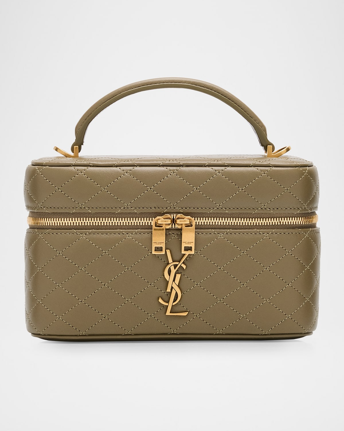 - Saint Laurent "Vanity" top handle bag in quilted leather - Features signature YSL logo lettering - Top handle - Detachable, adjustable crossbody strap, 20.4"L - Can be worn as a top handle or crossbody bag - Two-way zip top closure - Interior, one card slot - Golden hardware - Approx. 4.3"H x 7"W x 2.5"D - Made in Italy - Proposition 65 warning for California residents