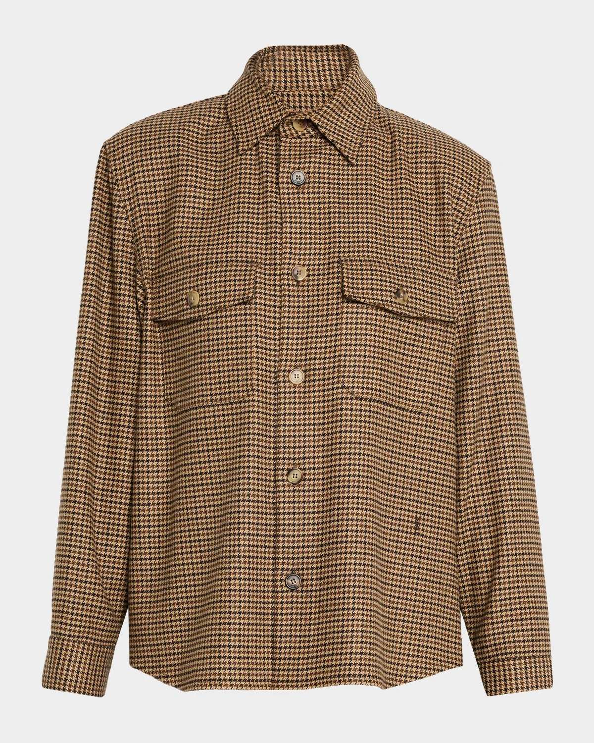 Saint Laurent shirt jacket is crafted of woolblend houndstooth Point collar; button front Long sleeves; button cuffs Chest button flap pockets Loose fit Shirttail hem Wool/acrylic/polyester Made in Italy