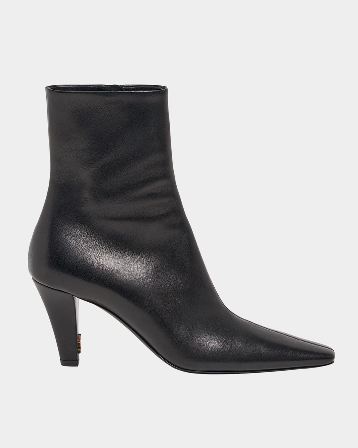 - Saint Laurent smooth calf leather ankle booties. - 3.00 in / 75 mm thick stiletto heel. - Square toe. - Side zip eases dress. - Leather lining and outsole. - "Jill" is made in Italy.