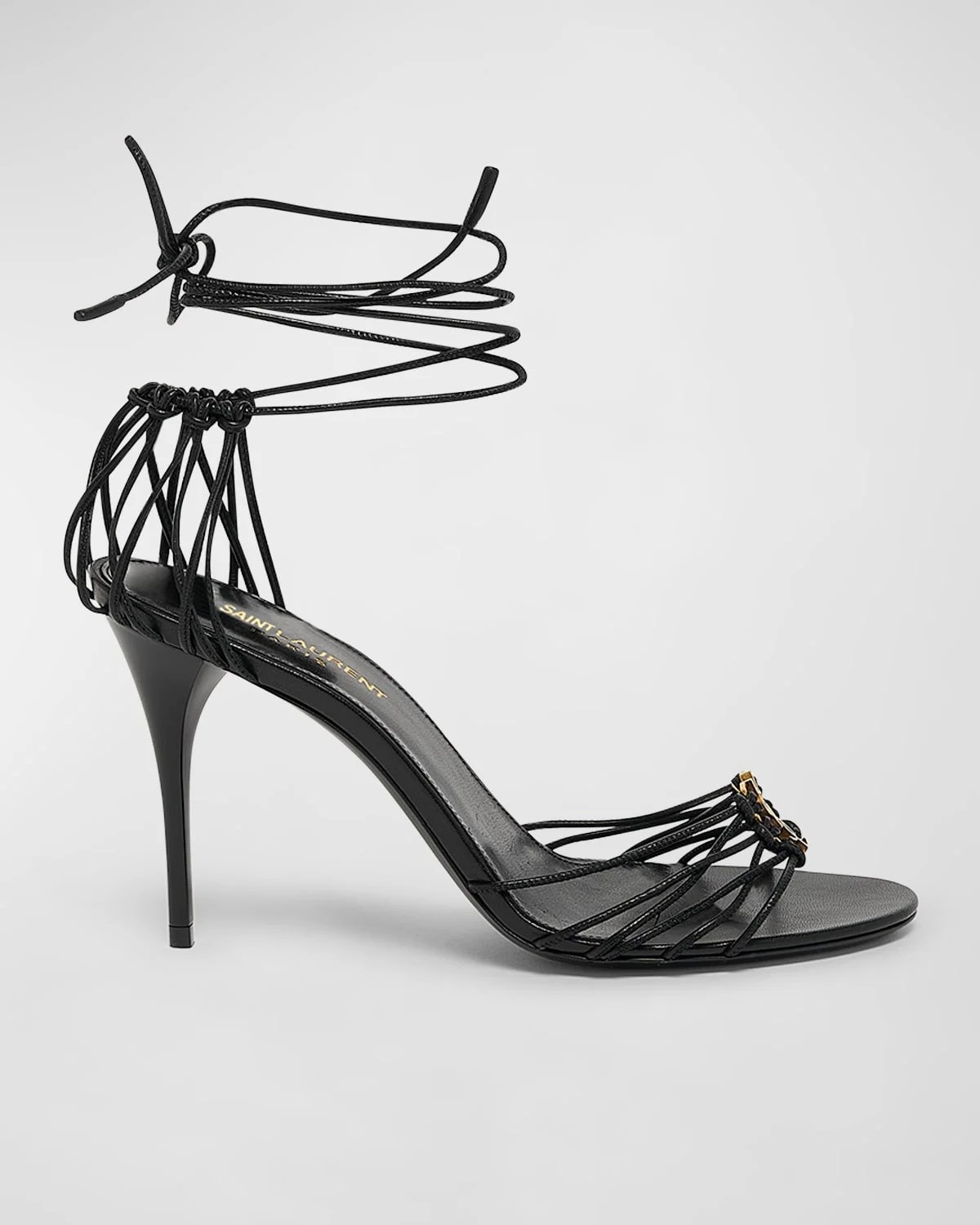 - Saint Laurent "Jota" strappy leather sandals with YSL medallion accent - 3.50 in / 90 mm stiletto heel - Open toe - Wraparound ankle ties - Leather outsole - Made in Italy
