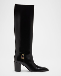 - Saint Laurent "Julia 75" leather knee-high boots with buckle accent - 3.00 in / 75 mm block heel - Almond toe - Pull-on style - Made in Italy