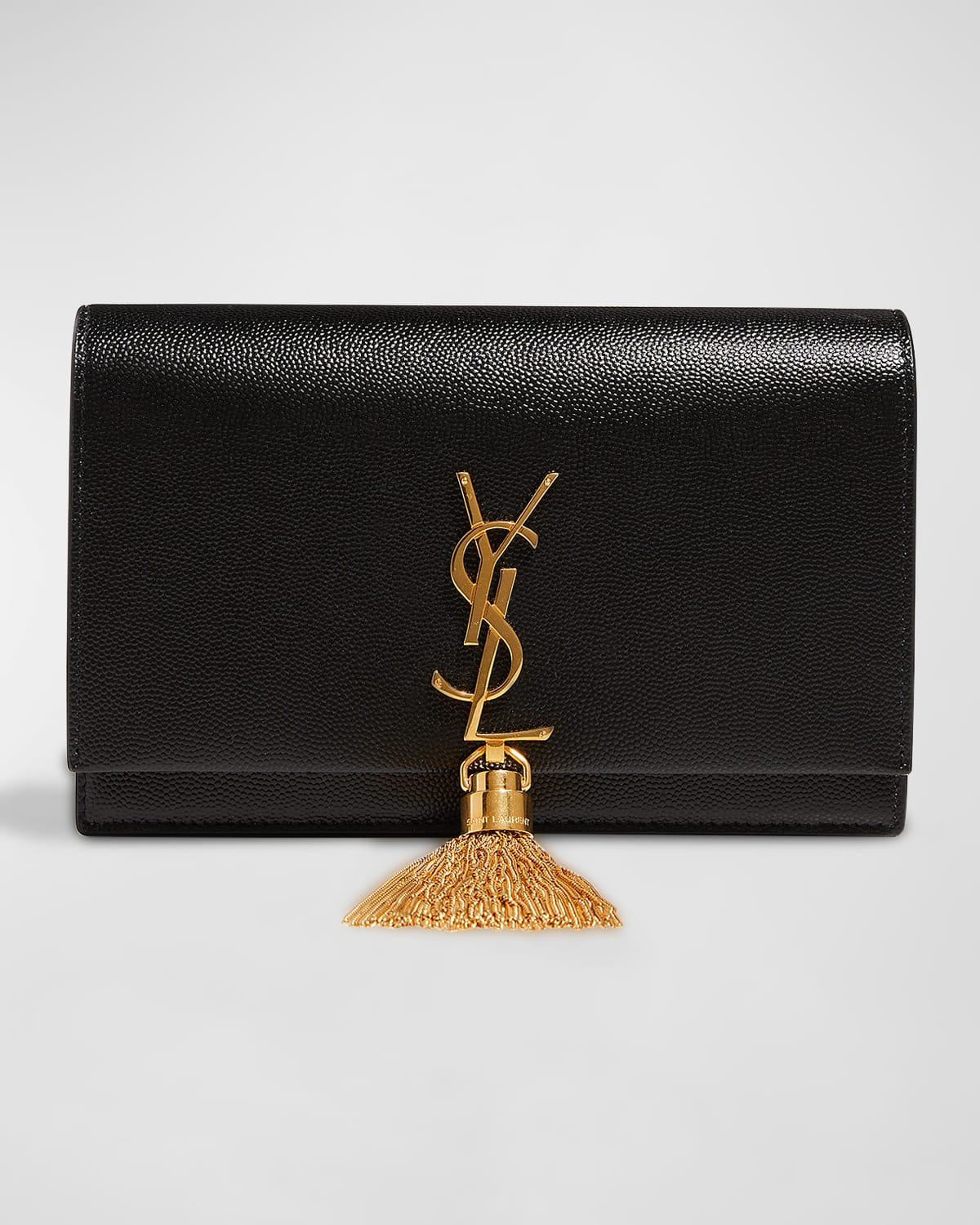 - Saint Laurent wallet crossbody bag in grained leather - Approx. 1.6"L x 4.7"H x 7.5"W - Golden hardware - Detachable curb chain and leather shoulder strap - Flap top with snap closure - Exterior, signature YSL logo and tassel at front - Interior, six card slots and one zip pouch - Leather lining - "Kate" is made in Italy