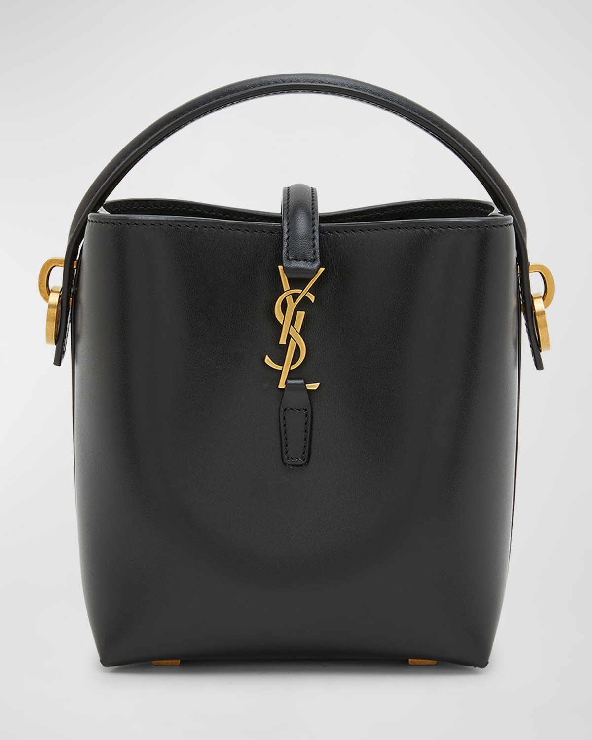 - Saint Laurent "Le 37" bucket bag in shiny soft leather - Flat top handle - Detachable crossbody strap - Can be worn as a top handle or crossbody bag - Open top with center YSL magnetic strap - Feet protect bottom of bag - Approx. 5.9"H x 5.1"W x 2.4"D - Professional cleaning recommended - Made in Italy