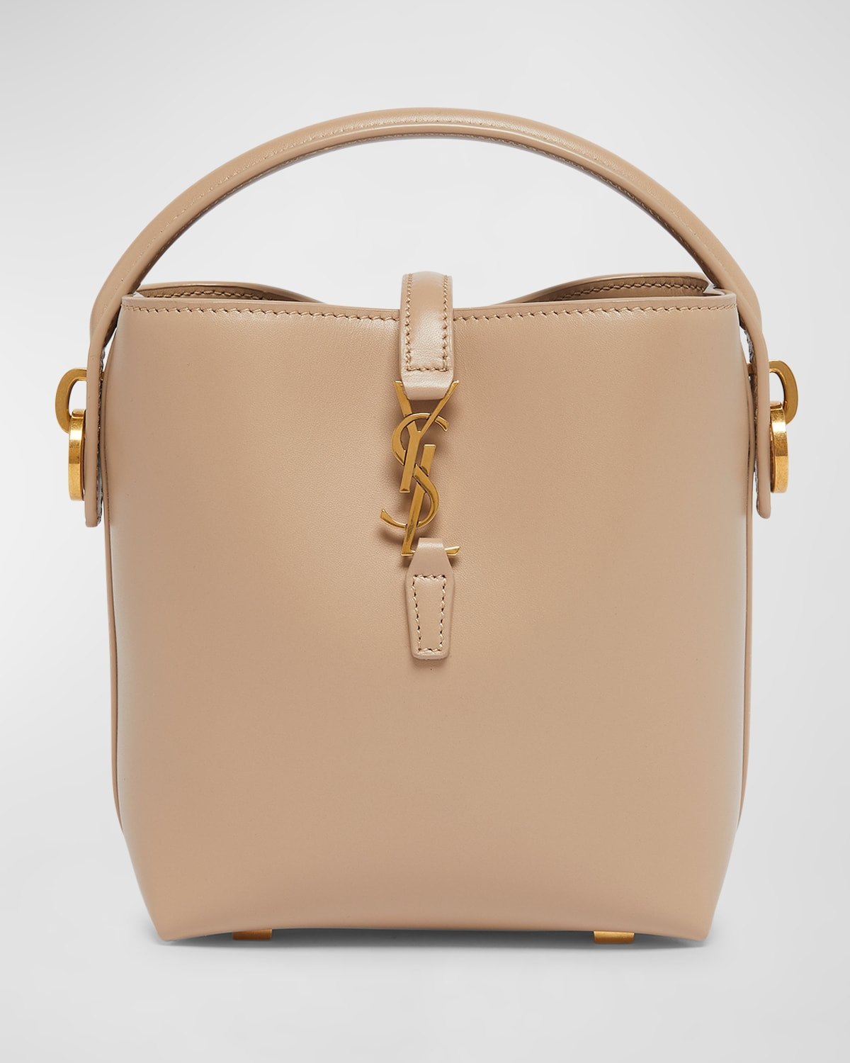 - Saint Laurent "Le 37" bucket bag in shiny soft leather - Flat top handle - Detachable crossbody strap - Can be worn as a top handle or crossbody bag - Open top with center YSL magnetic strap - Feet protect bottom of bag - Approx. 5.9"H x 5.1"W x 2.4"D - Professional cleaning recommended - Made in Italy