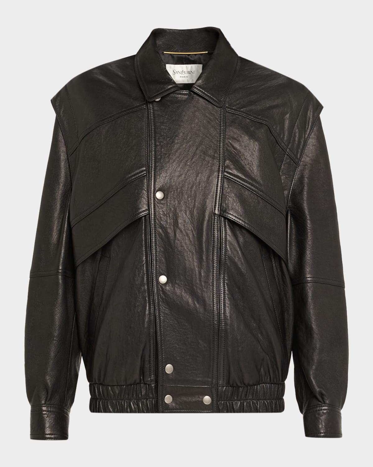 - Oversized flap-like panel detailing across the chest and shoulders adds architectural dimension to this edgy calf leather jacket by Saint Laurent - Point collar; concealed zip/snap placket - Dropped shoulders - Long voluminous sleeves; snap cuffs - Mid-length - Structured silhouette with a relaxed fit - Elasticated hem - Leather/cupro/cotton - Made in Italy