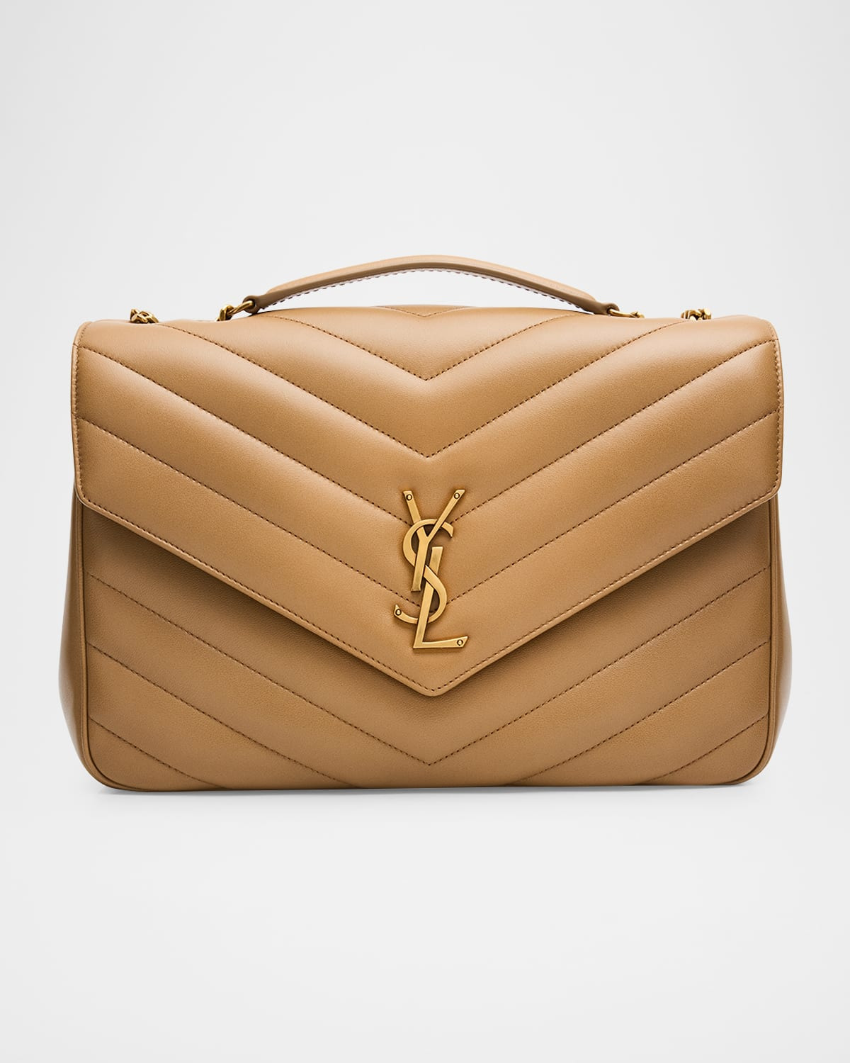 - Saint Laurent "Loulou" shoulder bag in overstitched Y-quilted calf leather - Sliding chain and leather shoulder strap can be worn single or doubled; 9.1"-19.7" drop - Flap top with snap closure. - Exterior, signature interlocking YSL logo - Gold-tone hardware - Interior flap pocket - Includes removable pouch and pocket mirror - Grosgrain lining - Approx. 12.6"W x 8.7"H x 3.9"D - Made in Italy. - Proposition 65 warning for California residents