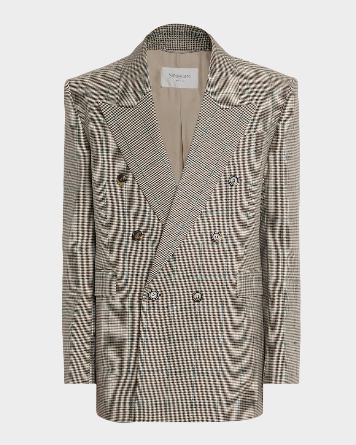 - Crafted in classic Prince of Wales wool, this Saint Laurent jacket channels timeless heritage style - Peak lapels - Long sleeves with four-button cuffs - Padded shoulders - Two jetted flap front pockets - Chest welt pocket - Two inner welt pockets - Double back vent - Oversized, elongated fit - Wool - Made in Italy