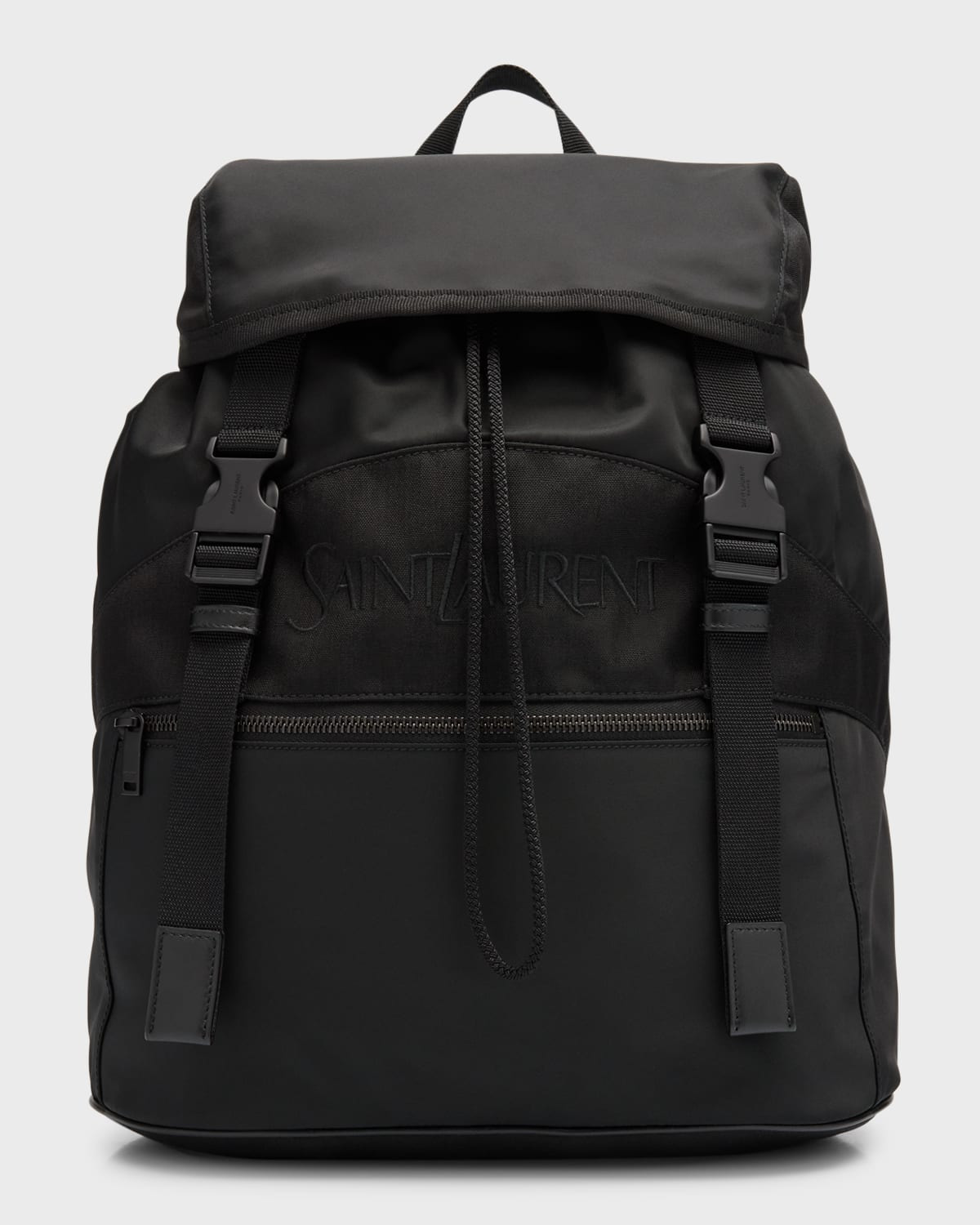 - Saint Laurent backpack in nylon with leather trim - Tonal embroidered logo lettering on the front - Top handle; approx. 2.4" drop - Two adjustable shoulder straps; approx. 13.8" drop - Flap top with drawcord closure - Adjustable side-release buckle straps - Exterior, one front zip pocket, one back card slot - Interior, one padded laptop pocket, one zip pocket - Nylon lining - Matte black hardware - Approx. 13.8"H x 11.8"W x 7.5"D - Made in Italy