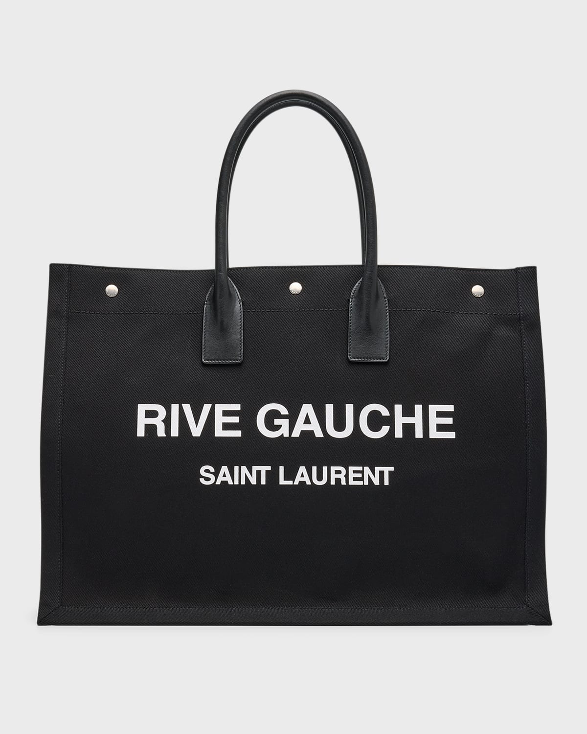- Saint Laurent tote bag in canvas fabric with large branded text at front - Two rolled leather top handles; 6.7" drop - Three brass snap closures - Interior, one zip pocket - Approx. 13.8"H x 14.6"W x 7.1"D - Made in Italy