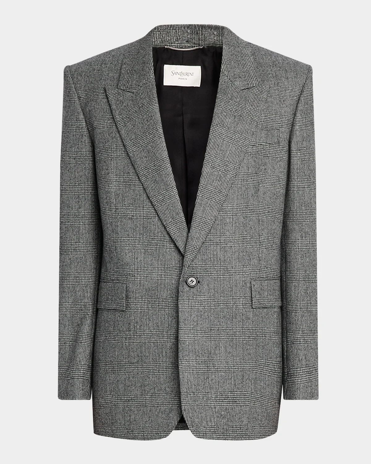 Saint Laurent wool jacket in Prince de Galles plaid Peak lapels Singlebreasted front Chest welt pocket Fourbutton cuffs Hip flap pockets Vented back Single buttonfront Wool Dry clean Made in Italy