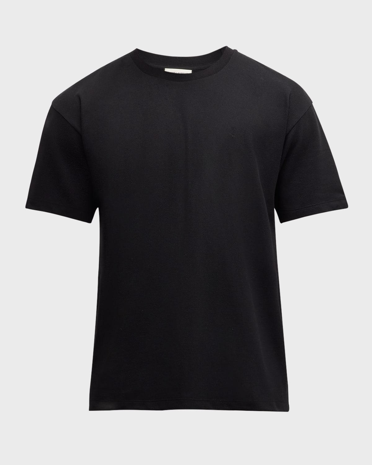 - Saint Laurent T-shirt in heathered pique - Crew neckline - YSL embroidery at chest - Short sleeves - Pullover style - Cotton/polyester - Made in Italy - Model is 6'1"/185cm.