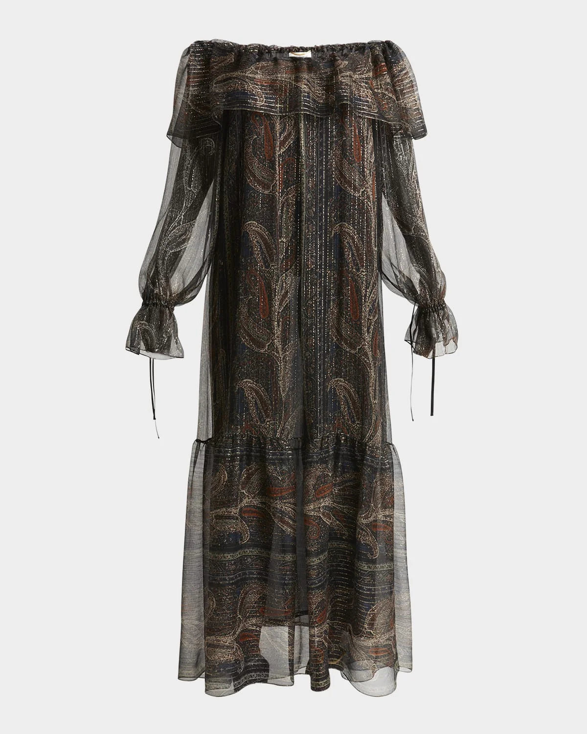 Saint Laurent metallic dress featuring a paisley print, foldover neckline, and a ruffle hem Off-the-shoulder neckline Long blouson sleeves; ruffle cuffs Full length Shift silhouette Slipover style Silk/polyester Made in France