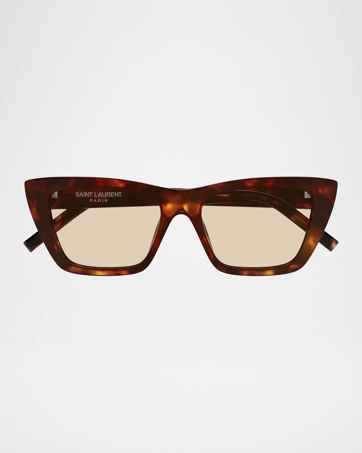 The "Mica" acetate sunglasses by Saint Laurent flaunt a chic street look. Lens/bridge/temple (in mm): 5316145 Angular cateye frames Solid lenses Fixed nose pads Thin, tapered arms Includes case and cleaning cloth 100% UVA/UVB protection Made in Italy