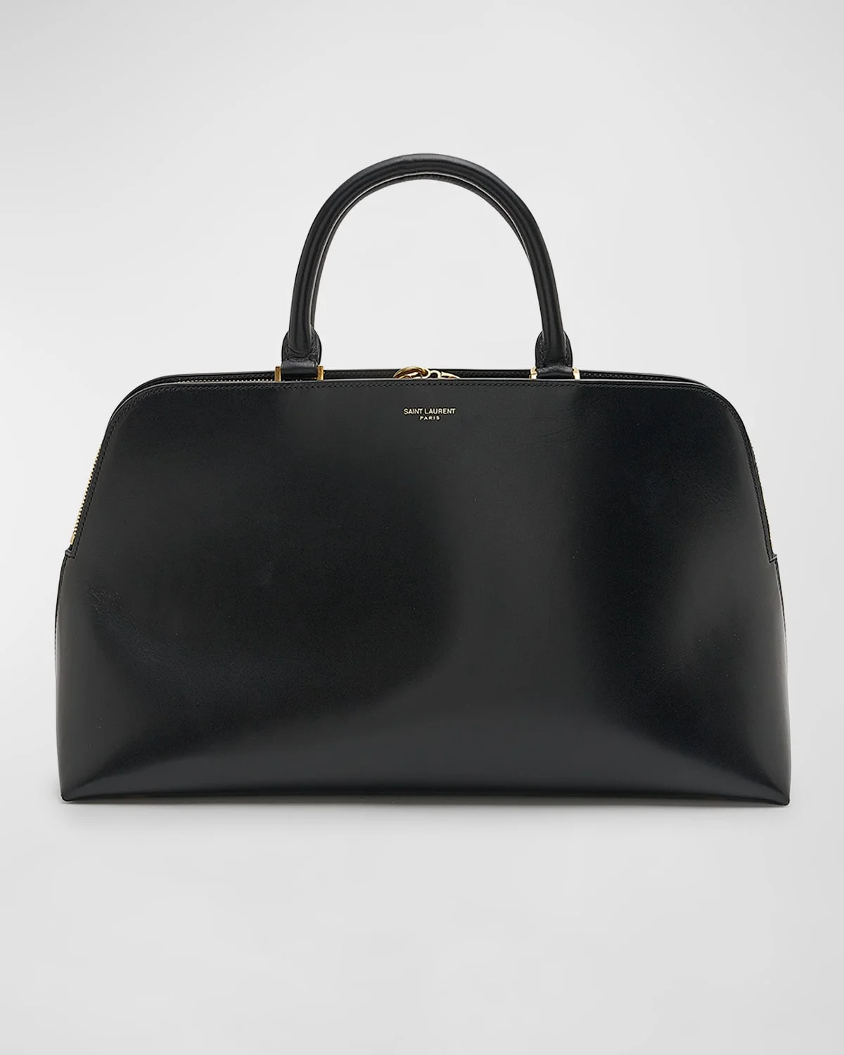 Saint Laurent "Sac de Jour" duffel bag in leather Rolled top handles Detachable, adjustable crossbody strap Can be worn as a top handle or crossbody bag Open top Interior, zip compartment with padlock accent, slip compartment, and one slip pocket Feet protect bottom of bag Approx. 8.9"H x 14.3"W x 4.7"D Professional cleaning recommended Made in Italy