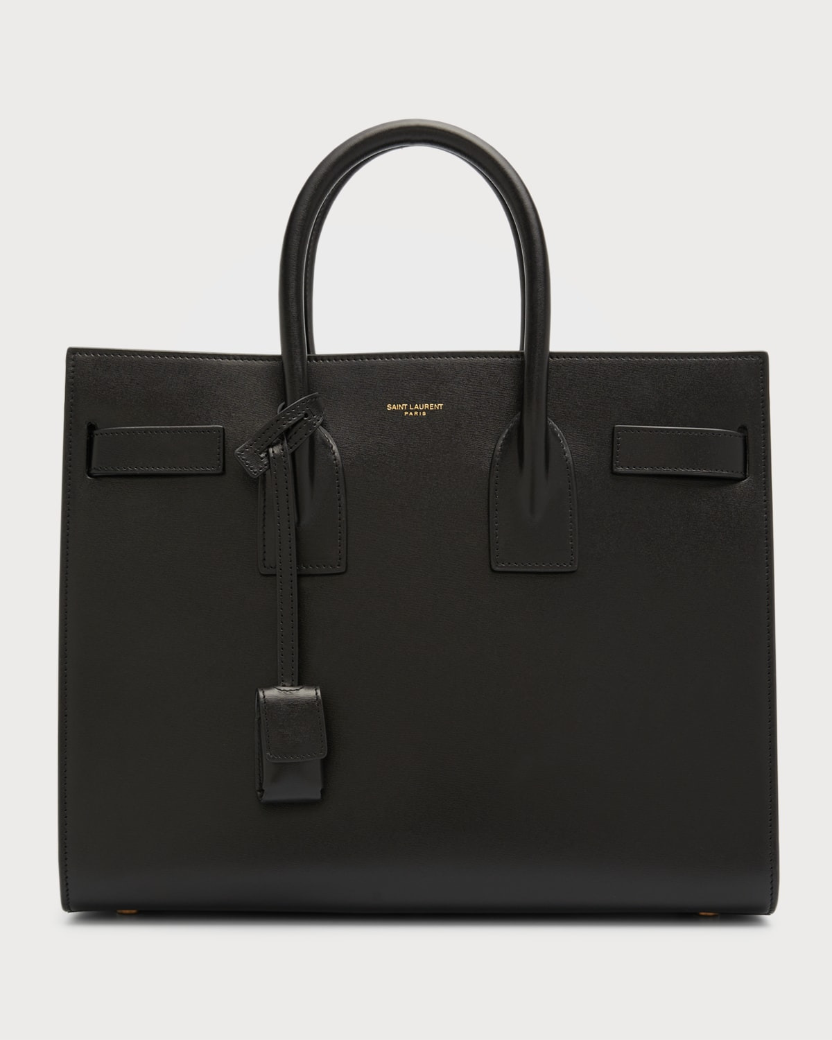 - Saint Laurent "Sac De Jour" top handle bag in calf leather - Rolled top handles with removable tag/padlock - Detachable, adjustable shoulder strap, 18.9" drop - Can be held by the top handles or worn as a shoulder bag - Side gusset snap straps - Open top - Center zip compartment divides interior - Feet protect bottom of bag - Approx. 10"H x 12.5"W x 6.1"D - Made in Italy