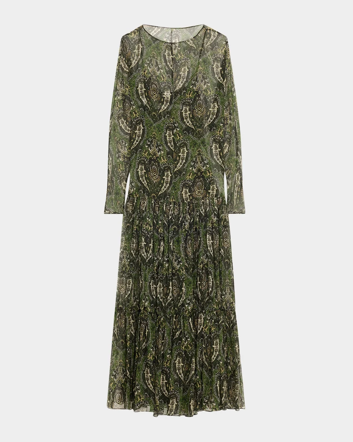 - Saint Laurent semi-sheer gown in paisley print with a pleated skirt - Slip underpinning - Bateau neckline - Long sleeves - Dropped waist - A-line silhouette - Falls below the ankles - Silk - Made in Italy - Proposition 65 warning for California residents
