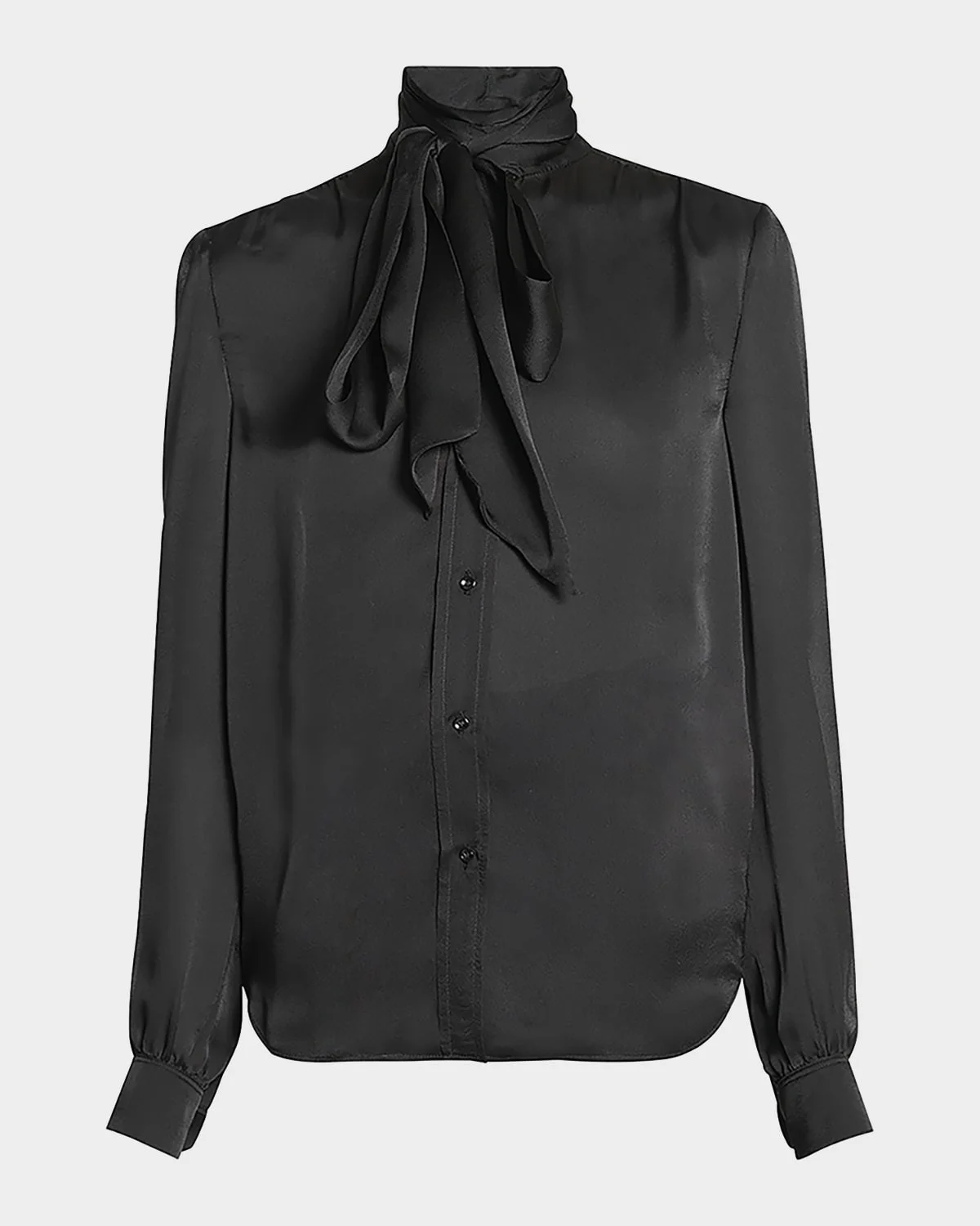 Saint Laurent semi-sheer & nbsp;button-front blouse features a tie neckline & nbsp; Long sleeves Back yoke & nbsp; Hip length & nbsp; Relaxed fit & nbsp; Silk Made in Italy Model is 5 & apos;10"/177cm.